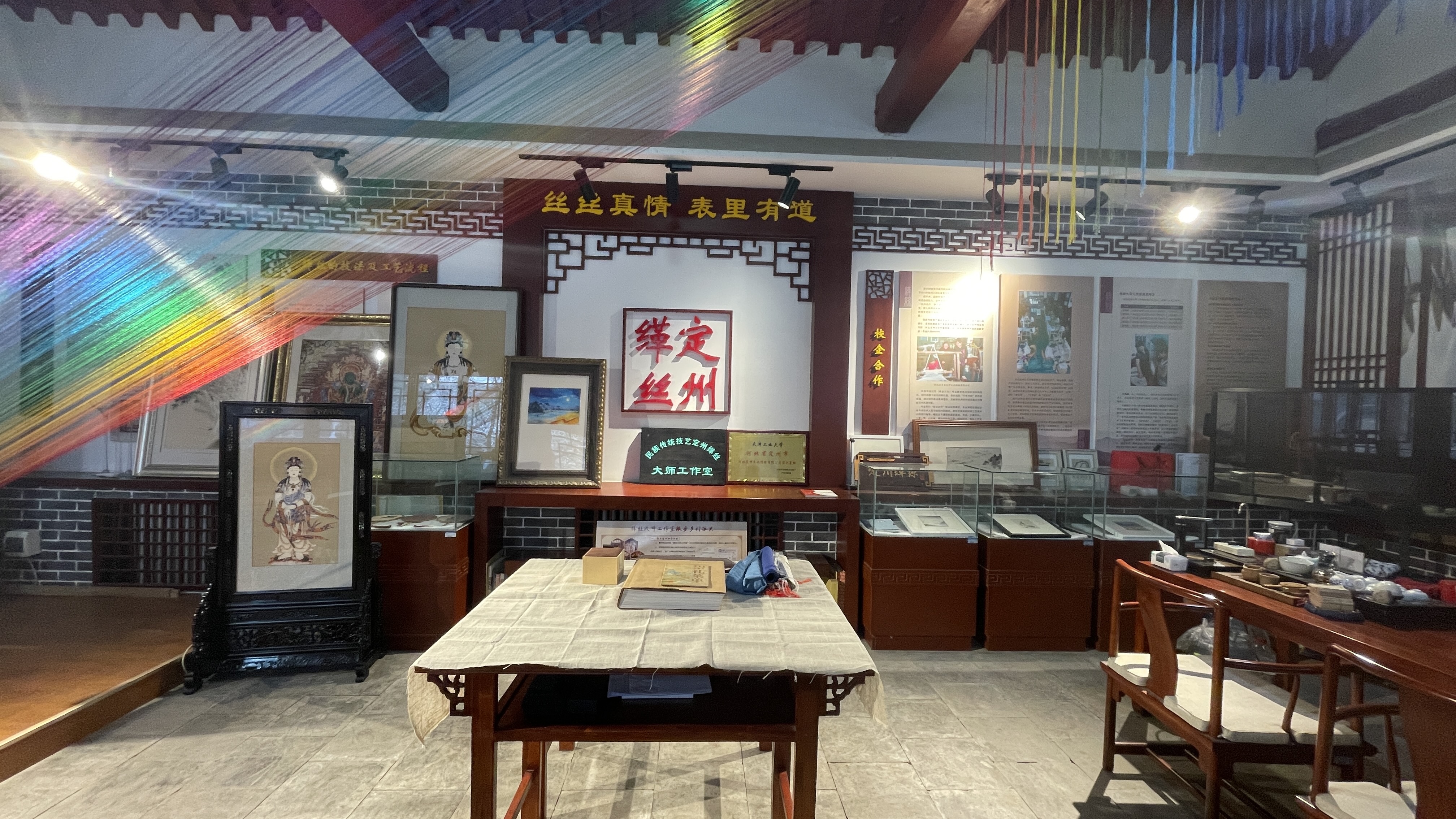 技艺传承:通过“大师带徒”“公益课堂”“非遗科普” 等形式,系统传承定州缂丝核心技艺,培育非遗传承新生力量;